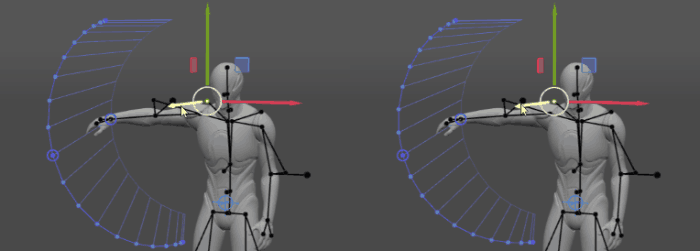 This type of kinematics produces arch-like interpolation for limbs - arms and legs of a humanoid character, paws of a quadruped etc. Unlike the regular Forward Kinematics, this interpolation does not inherit rotation from parent objects (like clavicles for the arms).