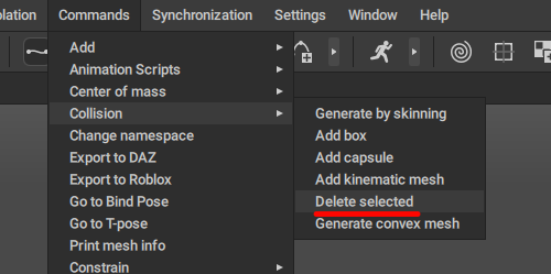 Colliders can also be managed in the Animation Mode, using a set of options in the Commands menu: