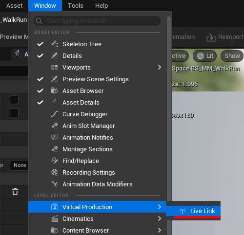 4. Select Virtual Production → Live Link from the Window menu: