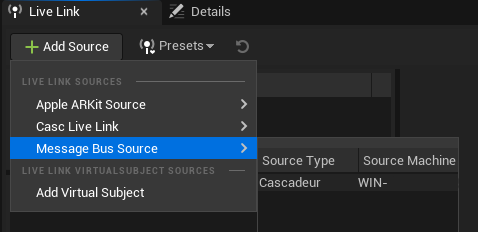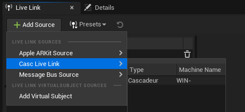 Click Add Source → Casc Live Link → Cascadeur:
