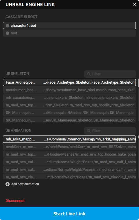 After you’ve connected Cascadeur and Unreal Engine via Live Link, a new window will appear in Cascadeur: