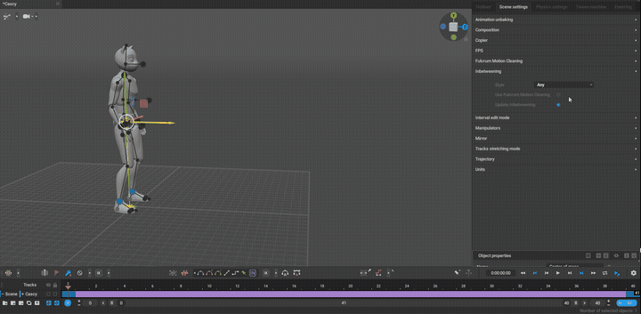 Inbetweening tool generates animation on the selected Timeline interval, based on the poses stored in the interval’s keyframes.