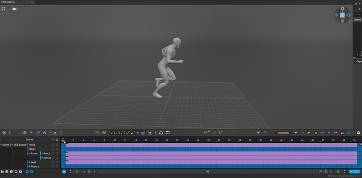 Example of AI interpolation applied to a baked animation. Body and Finger animation tracks have baked animation data, but the Legs, Arms, and Head rely only on the key poses at the start and end of the animation.