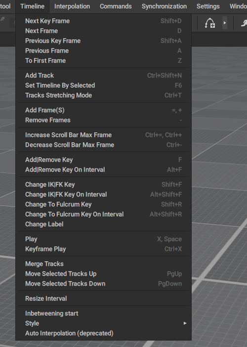 These options are used for manipulating the Timeline. Most of the Timeline functionality can be accessed through this menu.