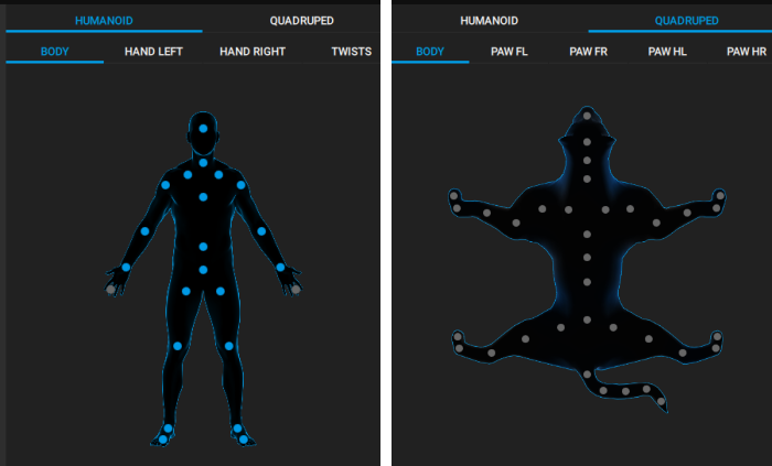 Comparison of Humanoid (left) and Quadruped (right) rigging templates.