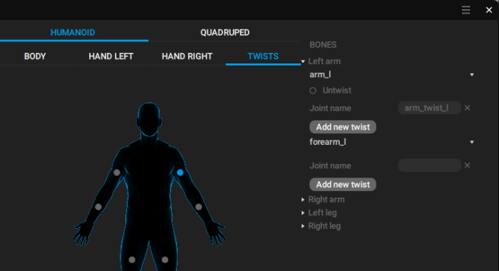 There is also the Twists tab, where you can set up twist bones: